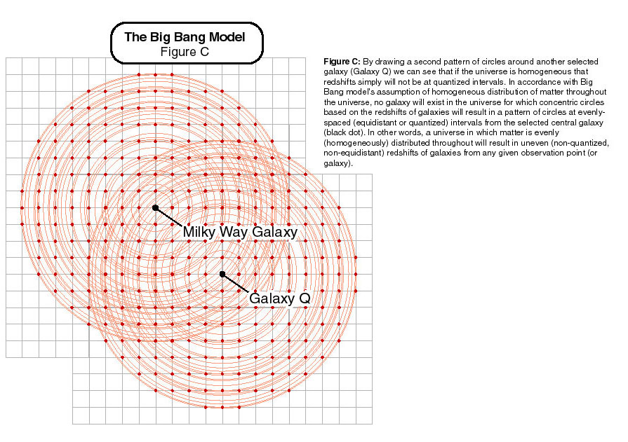 This series of illustrations depicts that the quantization of redshifts from Earth is a unique phenomenon that can only occur at a single location in the universe. These observations are incompatible with the Big Bang model's assumption that the universe is homogeneous.